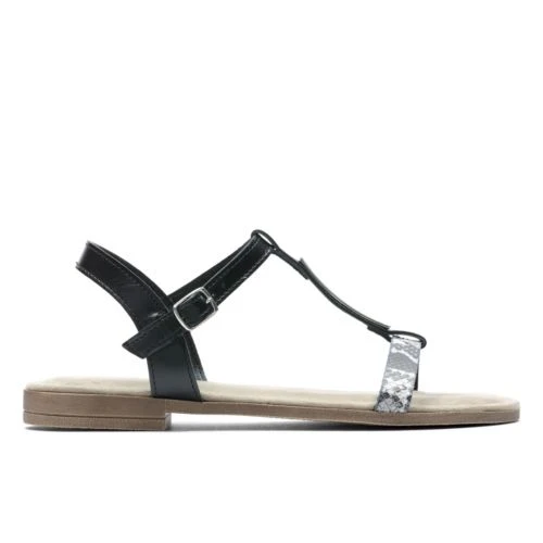 In need of a chic addition to your wardrobe? These leather sandals combine a T-bar silhouette, minimalist strappy upper and a touch of snake print. Practical features include a soft textile sock that feels great against bare feet, a secure buckle fastening and a grippy rubber sole.