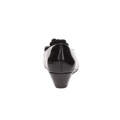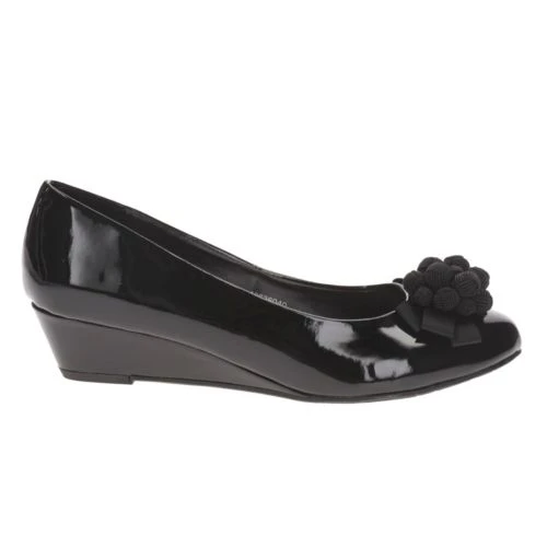 A great everyday style with a wearable height wedge heel. In black patent non-leather with oversized trim detail, these women’s shoes are both smart and stylish in wide fitting for additional comfort.