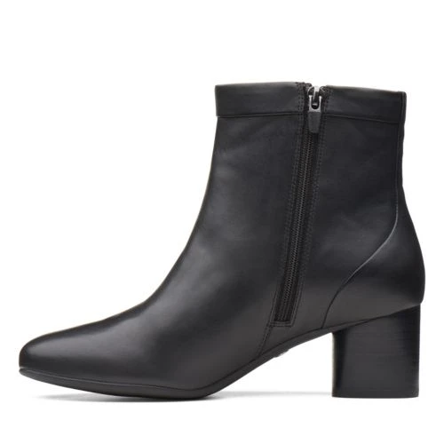 Un Cosmo Up, women’s ankle boots, black leather – A wardrobe staple, these black leather ankle boots are a versatile option for dress casual occasions. The minimal style upper is teamed with a leather wrapped 5.5cm block heel with a stack effect for a premium finish. Full leather linings and a padded topline ensure maximum comfort for feet as they walk.